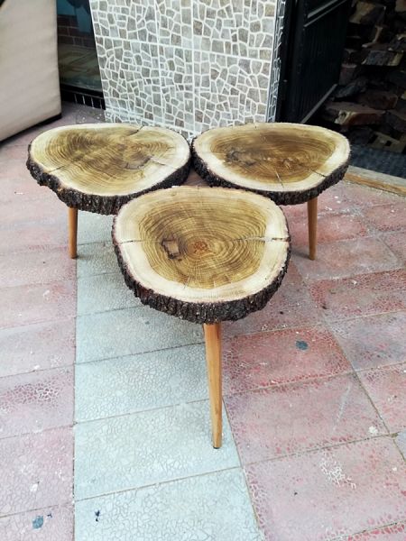 3 adet Meşe ağacı kütüğünden hazırlanmış doğal tek parça orta sehpa. Ahşap mobilya ve aksesuarlar ile kullanarak evinizin havasını değiştirebilirsiniz.